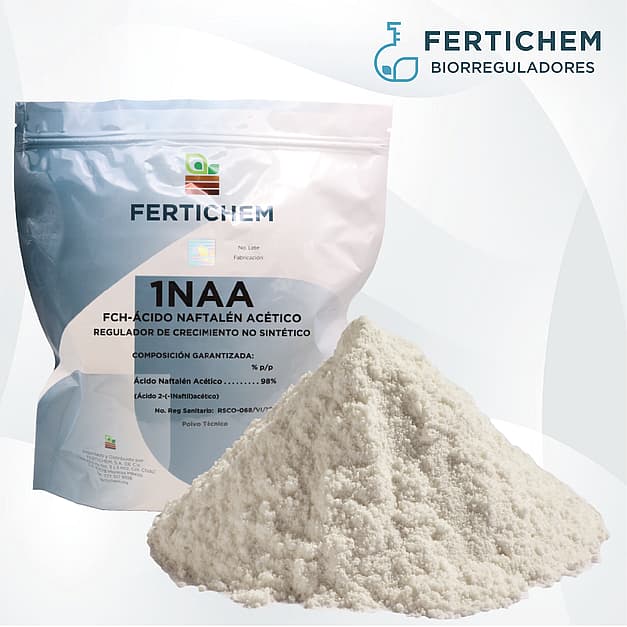 El ácido naftalenacético (1NAA) es un regulador de crecimiento versátil que mejora floración, maduración, cuajado y calidad de frutos, aumentando el rendimiento y reduciendo la caída. Puede disminuir la cantidad de semillas e inducir frutos sin semilla en algunos casos. También estimula brotes, botones y el desarrollo en cultivos como maíz, trigo y algodón, favoreciendo trasplantes y mejorando el peso y productividad del cultivo.