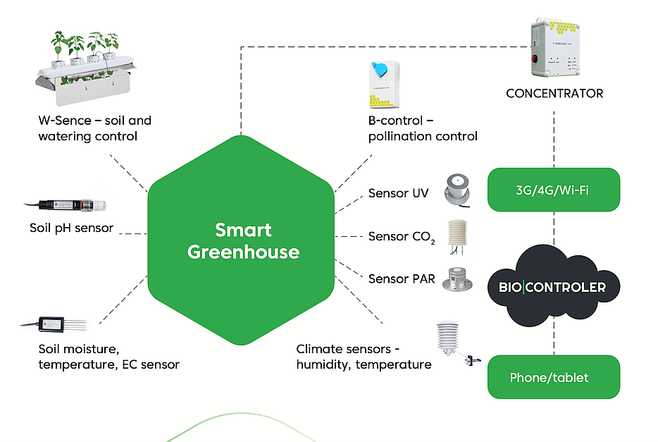 Our solution allows for the creation of a wireless sensor network in a greenhouse, utilising even the sensors already installed in the greenhouse. - Quick adjustment of climate, irrigation, pollination, and fertilisation for increased yields - Ability to connect any existing sensor to the system - Recording 24/7 recording and access to data from any device