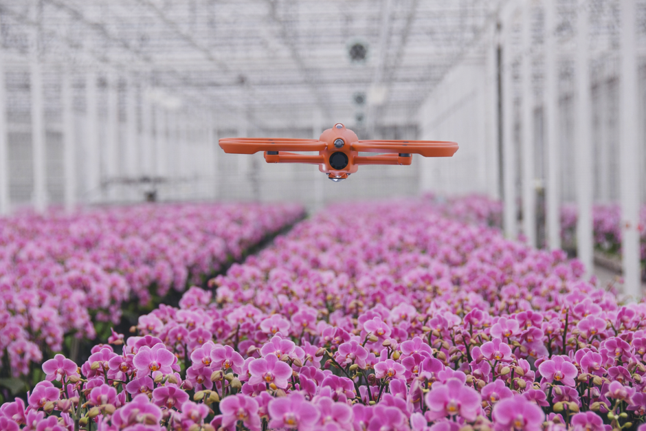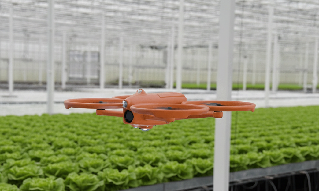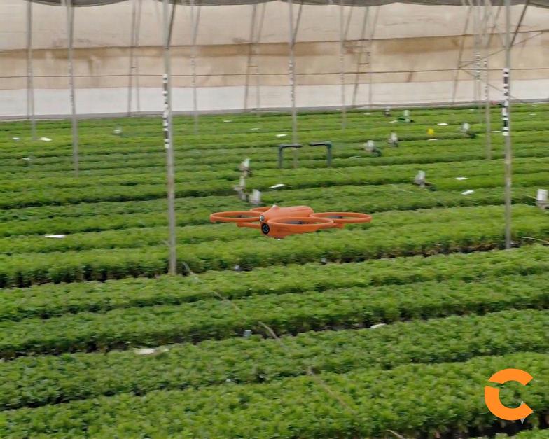 Fully autonomous drones for monitoring crop growth and health across multiple crops, including potted plants, cut flowers, lettuce, young plants, and mother stock.