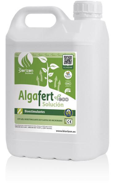 Algafert is a liquid biostimulant formulated with microalgae extract, P₂O₅ (0.15%), N (1.5%) and K₂O (3.4%).