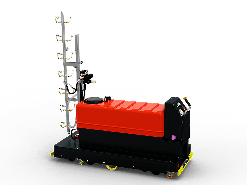 HSE 300 is the latest solution for spraying in a greenhouse. Two spraying bars up to 3m high (one spraying the end of the row, the other spraying the plants on both sides) equipped with nozzle heads for adjustment and individual setting of the spray liquid stream. The device moves on a suitable track with heating pipes in the greenhouse and is equipped with a 300L tank. Entire device is controlled by a PLC controller, which allows you to set the route, speed, turn on the appropriate spray bar while driving,